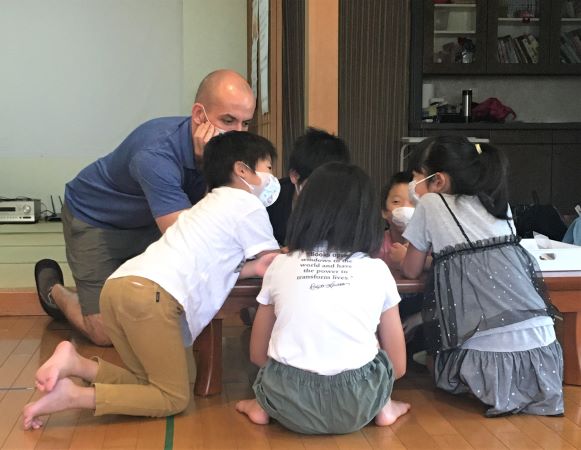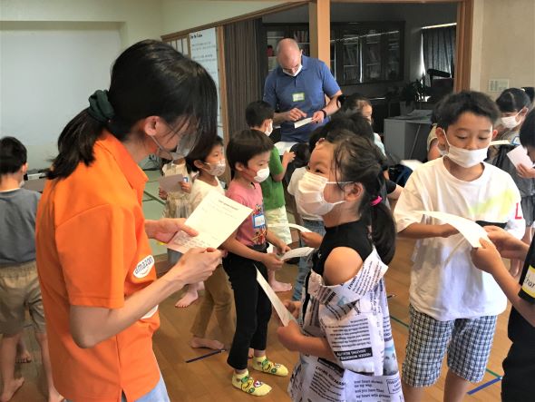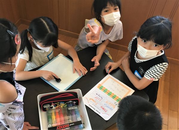 そして、サービス・商品を提供するために何が必要か…それはどのようにして用意するのかも一緒に考えました。English Treeには”Rainbow Shop”という、テーブルやいす、クッション、タオル、プール、かき氷機、段ボール、画用紙、折り紙、袋などなど、たくさんのものを貸し出し・売り出ししている素敵なお店があります!(Rachelの母親と外国人スタッフが担当!(笑))そして、今年はRachelがAmazan(アマザン)として注文を受け、商品を配達するというサービスも導入。子どもたちは、売るだけでなく買うことも楽しみながら準備を進めました。